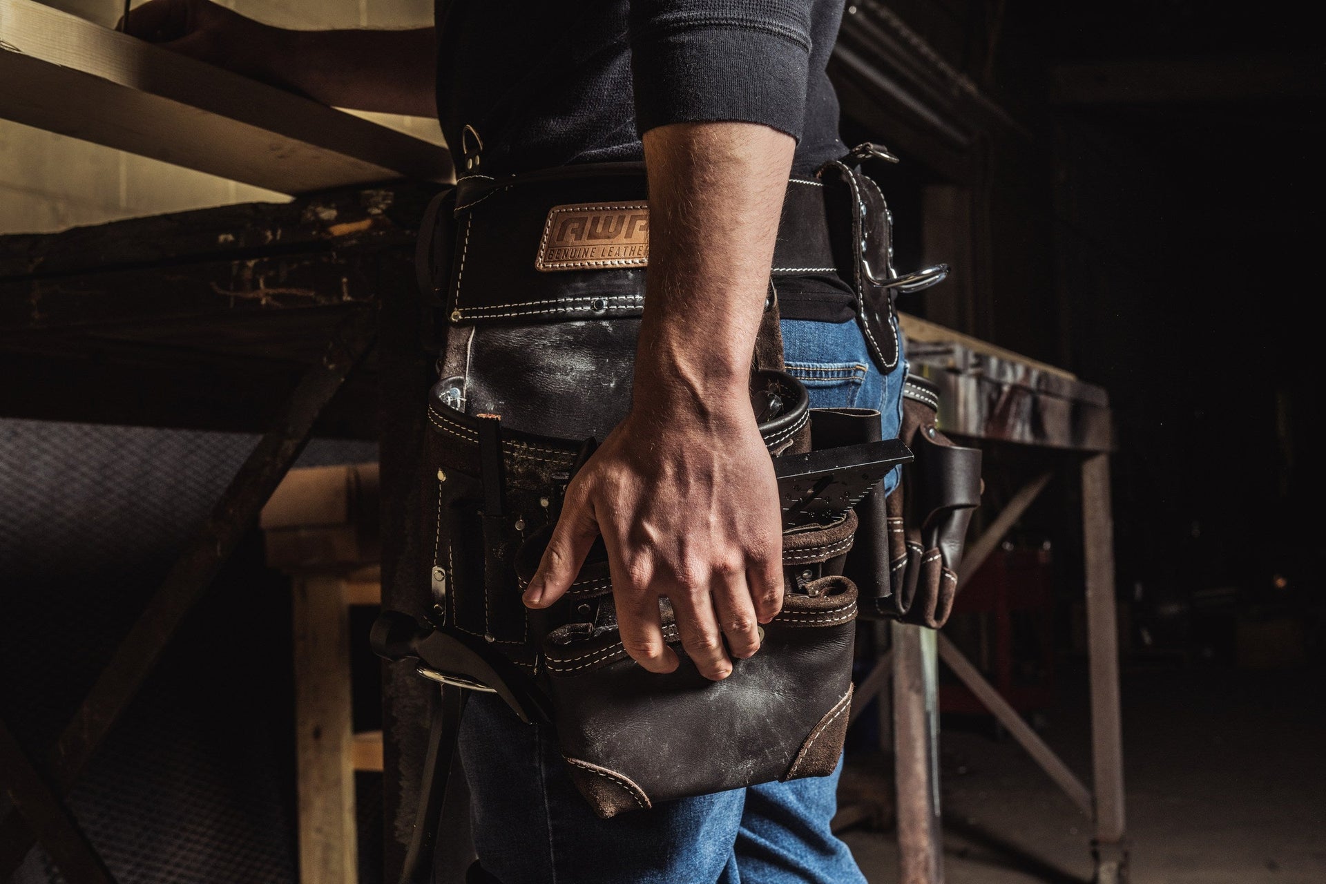 Featuring the innovative, spring-loaded technology from AWP, the Oil-Tanned Leather Tool Rig includes dual TrapJaw pouches that snap open wide to provide easy-access and snap closed to secure small tools and fasteners inside. Crafted from premium oil-tanned leather for maximum durability, this rig offers 2 large capacity pouches, multiple smaller pockets, and 2 metal hammer loops so you can easily carry plenty of tools on the jobsite.