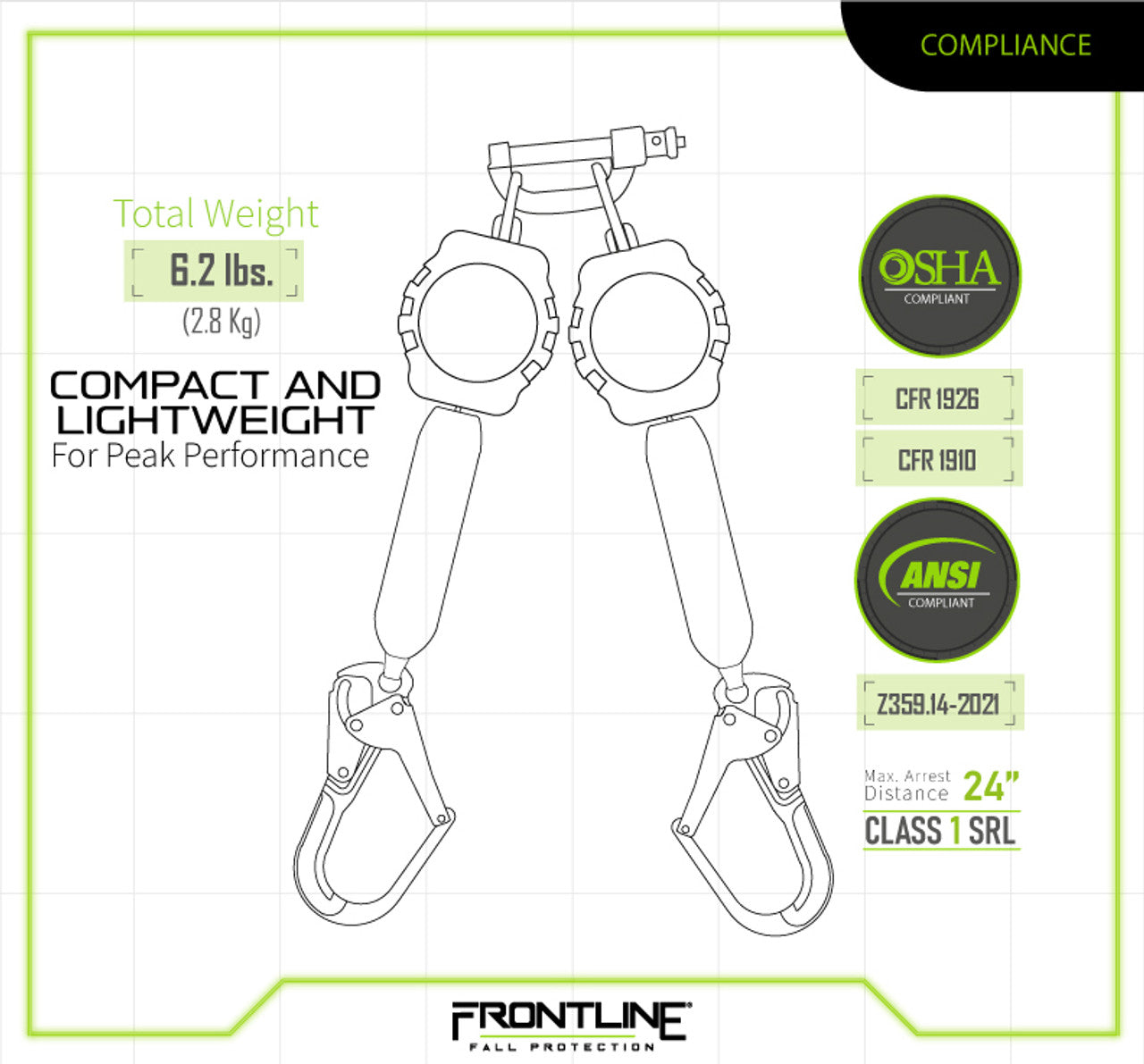 Las líneas de vida autorretráctiles Frontline son la solución ideal para trabajos en altura, donde una reacción rápida y segura es fundamental. Diseñadas para funcionar y activarse en segundos en caso de caída, las líneas de vida autorretráctiles Frontline ayudan a limitar la distancia de caída libre y a reducir los impactos en el cuerpo, brindando una experiencia de trabajo más segura. Fabricadas para superar las expectativas y probadas por un laboratorio independiente acreditado según la norma ISO 17025:2017, estas líneas de vida autorretráctiles son robustas, duraderas y brindan a los usuarios la confianza necesaria para realizar su trabajo con tranquilidad cuando se requiere protección contra caídas.