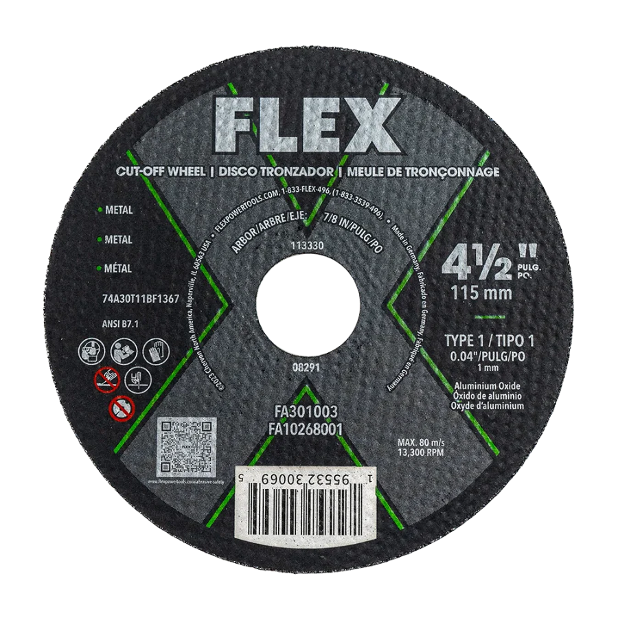 Corte pernos, candados, varillas roscadas y exceso de placa de acero con el disco de corte FLEX de 4-1/2" Tipo 1. Diseñado para cortes profundos, este disco de corte Tipo 1 ofrece una mayor superficie de corte para una menor interferencia con la pieza de trabajo durante el corte. Su diseño reduce la vibración para cortes suaves y eficientes con mínimo desplazamiento del disco. El disco de corte cuenta con un grano de óxido de aluminio que corta el material rápidamente sin generar calor excesivo, y su revestimiento resistente al agua retarda la exposición a la humedad para una mayor vida útil. Diseñado para aplicaciones de corte de metal, el disco de corte FLEX de 4-1/2" Tipo 1 corta acero, acero al carbono y hierro fundido.