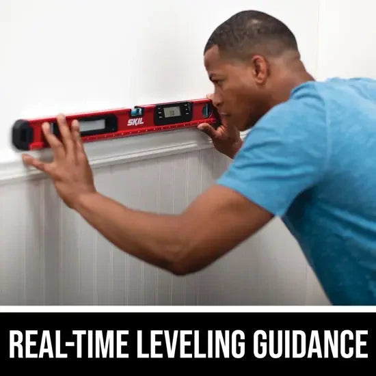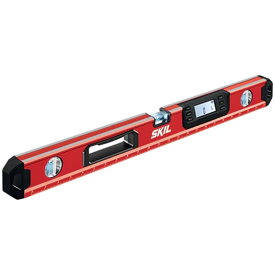 El nivel digital SKIL de 24 pulgadas es fácil de usar y está repleto de funciones. Su mayor longitud lo hace ideal para nivelar sobre varios cuadros, colocar estantes más anchos, instalar armarios y realizar muchos otros proyectos de bricolaje en casa. Los indicadores azules de alto contraste son muy precisos y fáciles de ver. La pantalla LCD digital está retroiluminada, lo que permite leerla desde cualquier perspectiva y se ajusta a la orientación correcta independientemente de cómo se sujete. Las flechas y los tonos audibles opcionales le guían hasta el ángulo perfecto, y la función de retención le permite congelar el valor de un ángulo para compararlo con otro. La función de memoria le permite almacenar 10 valores y consultarlos posteriormente. Su borde magnético facilita especialmente el uso del nivel con una sola mano.