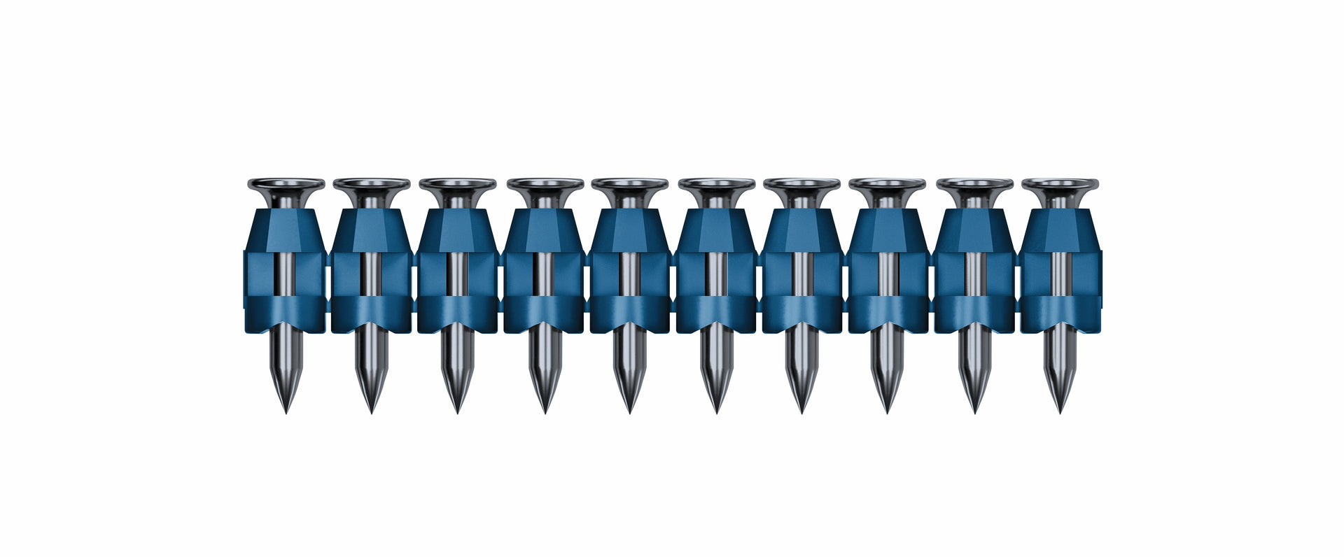 Los clavos para hormigón en tiras de Bosch están diseñados para su uso con la clavadora de hormigón inalámbrica GNB18V-12 de 18 V. Ideales para la construcción de estructuras, los clavos fijan las guías metálicas al hormigón. La clavadora de hormigón Bosch de 18 V incluye un cargador de 22 clavos en tiras (un cargador de mayor capacidad, con capacidad para hasta 44 clavos en tiras, se vende por separado) y una boquilla de un solo disparo. Los clavos y la clavadora de hormigón GNB18V-12 se probaron y certificaron conjuntamente (ICC). La clavadora inalámbrica es el sustituto ideal de las clavadoras de hormigón a gasolina, ya que elimina la necesidad de cartuchos de gas consumibles. El ajuste de profundidad es fácil de usar mediante un interruptor deslizante intuitivo. Los clavos están disponibles en cinco longitudes diferentes, desde 5/8" hasta 1-1/2".BENEFICIOS