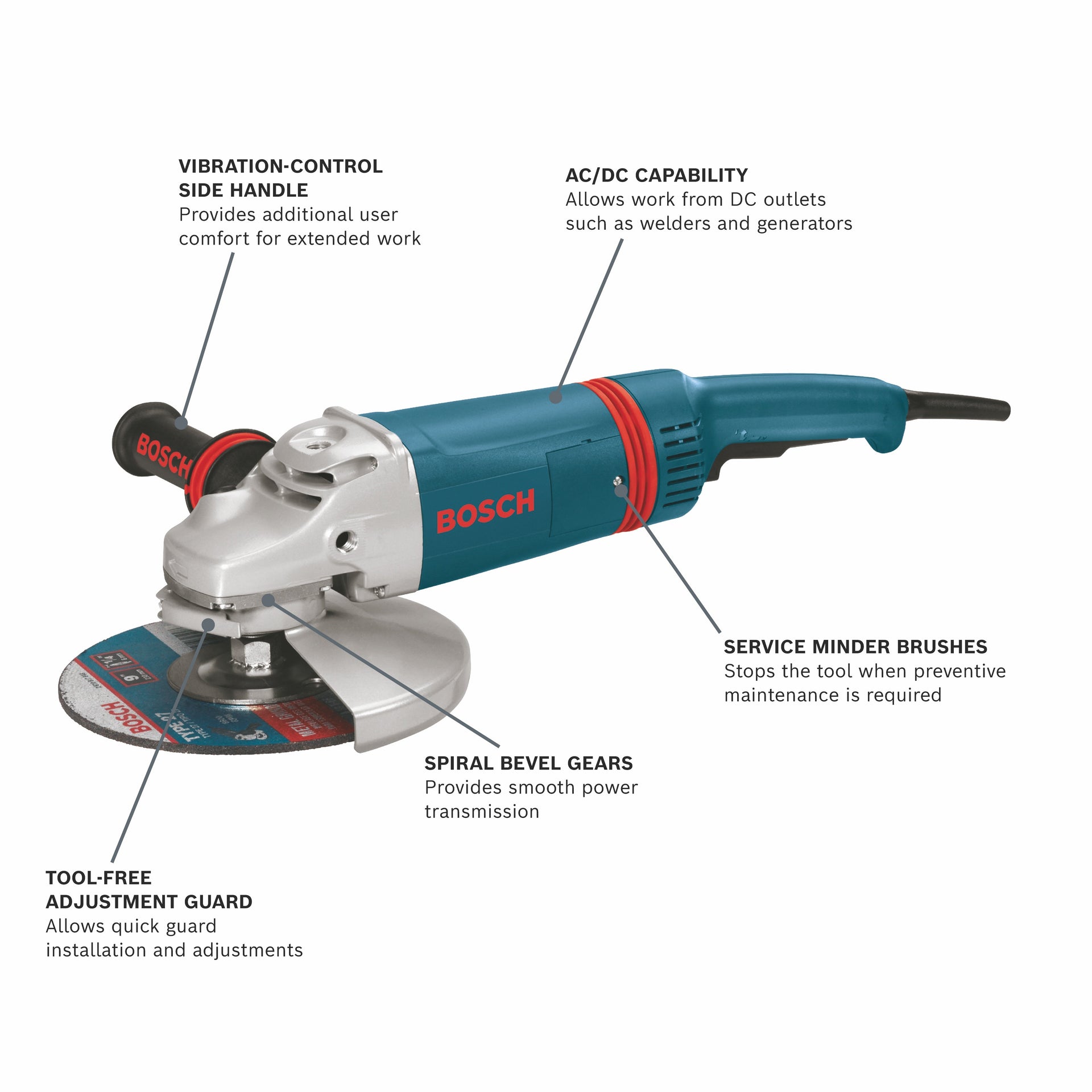 - Amoladora angular grande BOSCH 1893-6 de 9 pulgadas y 15 A con mango de cola de rata