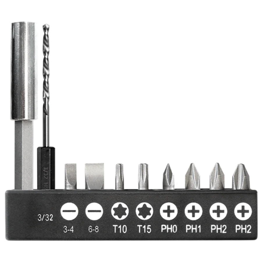 Destornillador de 4 V con tecnología Circuit Sensor™, cable de carga USB, 8 puntas de 1 pulgada, 1 broca de 3/32 pulgada y 1 portapuntas magnético de 3 pulgadas.
