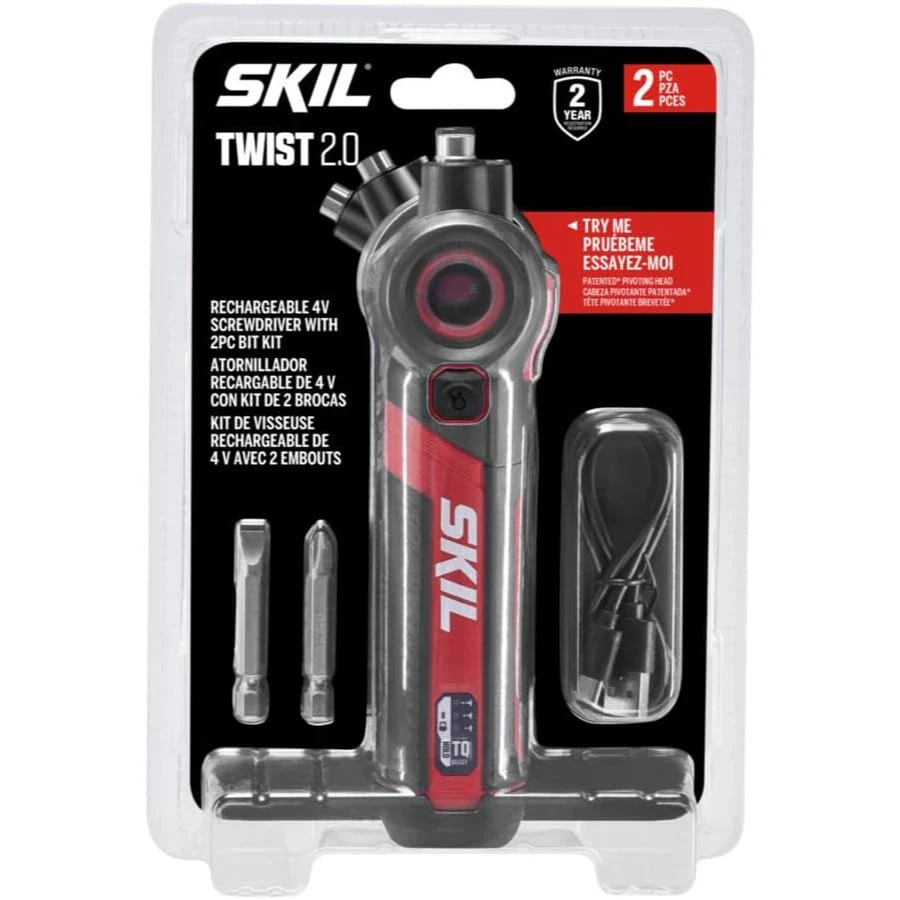 Desde ensamblar muebles y juguetes hasta apretar tornillos en armarios de difícil acceso, realice pequeños trabajos y reparaciones de forma rápida y cómoda con el destornillador SKIL Twist 2.0 recargable de 4 V. Este destornillador eléctrico ergonómico cuenta con un cabezal pivotante (patente en trámite) que se bloquea en tres posiciones (0, 22,5 y 45 grados) para mayor comodidad en espacios reducidos. Ofrece tres ajustes de par que le permiten adaptarse a la aplicación en cuestión. Su botón de disparo está convenientemente ubicado para facilitar su uso con un solo dedo, y su brillante LED ilumina los espacios oscuros. La batería integrada del destornillador inalámbrico cuenta con un puerto de carga USB-C con cable incluido para una recarga cómoda.
