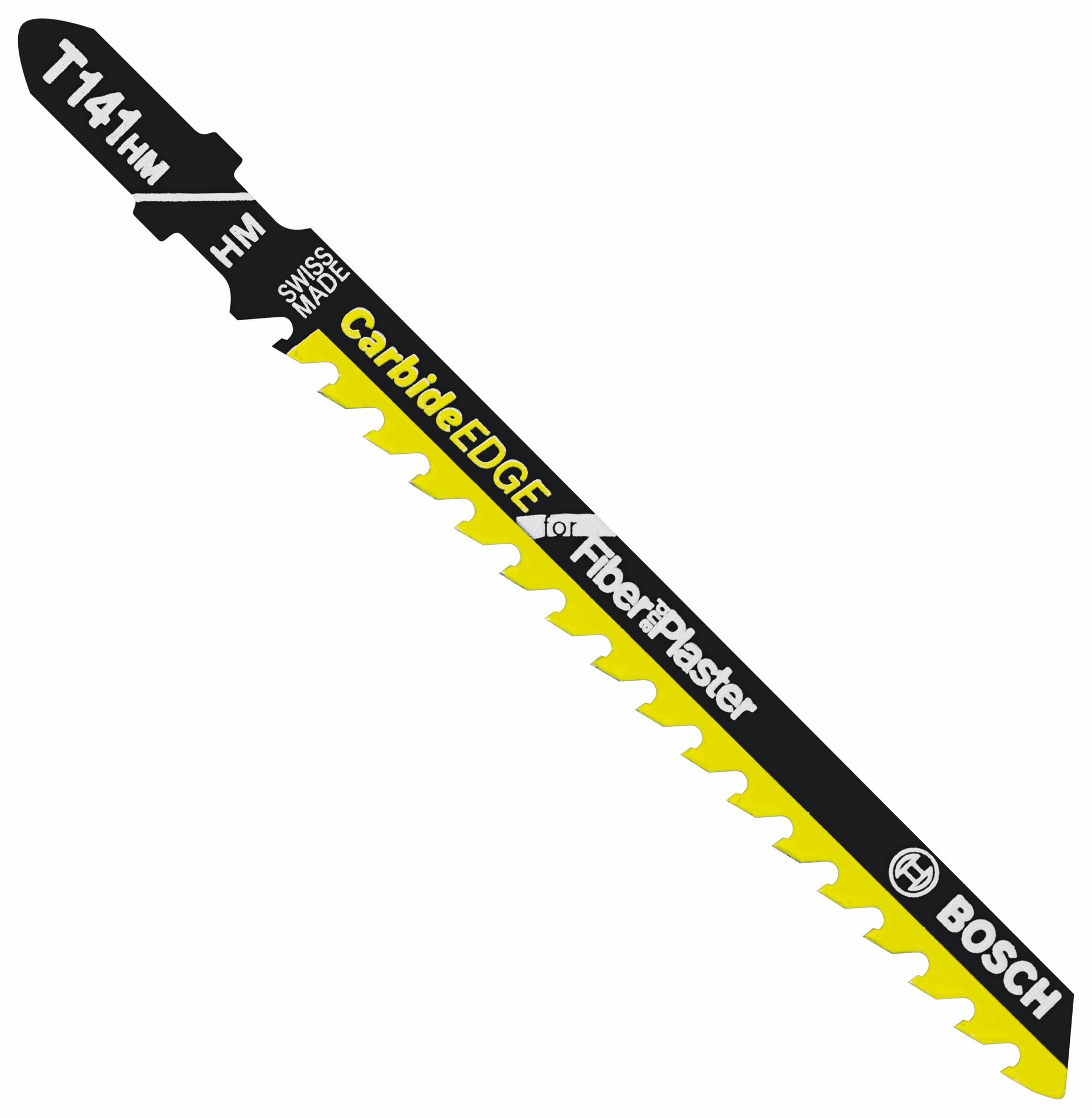 - Hoja de sierra caladora BOSCH T141HM1 de 4 pulg. y 6 dientes por pulgada con borde de carburo para fibra de vidrio y yeso con vástago en T
