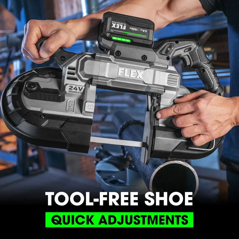 Power through large PVC pipe, angle iron, and up to 4-inch black iron pipe with the FLEX 24V 5” Deep Cut Band Saw. This powerful cordless band saw features a high-power brushless motor that provides fast cutting speeds along with a lightweight magnesium housing for maximum durability. Its tool-free quick adjustment shoe allows fast adjustments for flush cuts and a speed dial with variable speed trigger provides multiple speed options at your fingertips. An LED light illuminates dark work areas, and a rafter hook allows quick and easy storage from ladders, struts, and FLEX STACK PACK™ rack rails between cuts. This portable band saw delivers the FLEX Advantage of unmatched battery power, runtime, and fast charging (battery and charger sold separately). It’s protected by the FLEX Limited Lifetime Warranty when registered within 30 days of purchase at registermyFLEX.com through December 31, 2024.