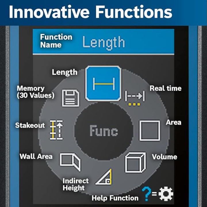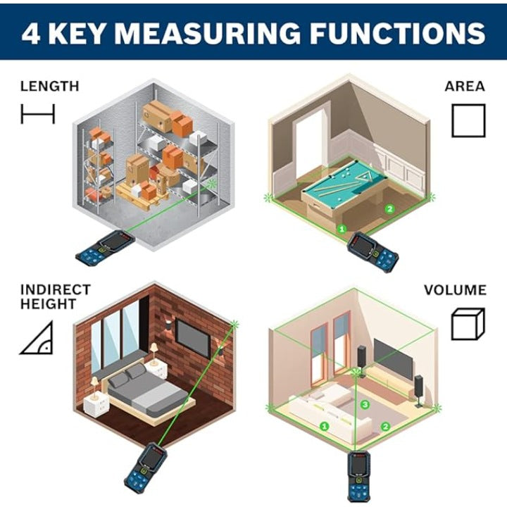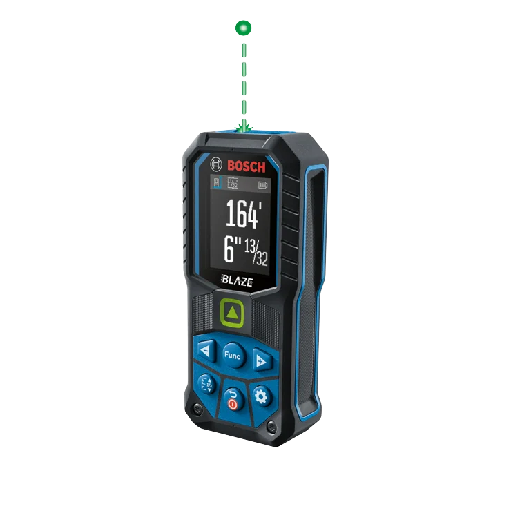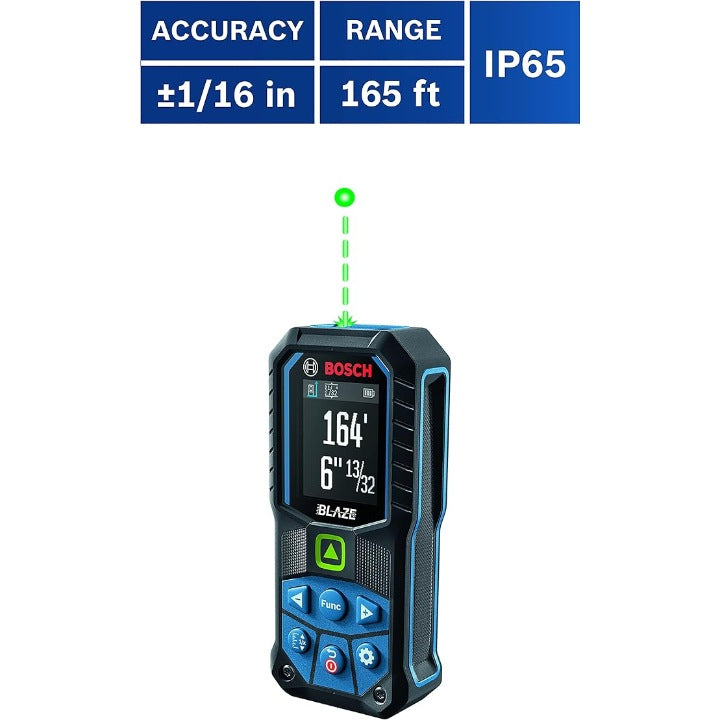 This 165 Ft. green-beam laser measure is a fully featured tool with an easy-to-read color display, great accuracy and reinforced housing for durability. The Bosch BLAZE™ GLM165-25G uses green-beam technology, which generates a point/dot up to 4X brighter than standard red beams. The laser has accuracy up to ±1/16 In., plus it includes a rounding button that rounds the measurement to the fraction that best suits the application and haptic feedback for loud jobsites. The digital laser measure also offers an IP65 rating, and it has an ergonomic design for better grip. It includes 11 different measuring functions, including real-time length, length, area, volume and indirect functions, and addition/subtraction capability.