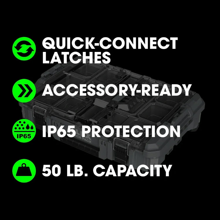 Organize and easily access the bolts, screws, and supplies you need for a day on the job with the FLEX STACK PACK™ Organizer Box. Find the pieces you need quickly with its clear, see-through cover, then snap the lid securely back into place with the two-piece durable lock. IP65 all-weather protection shields your tools and accessories from the elements, and an impact-resistant polypropylene body with aluminum reinforced corners offers protection from the toughest jobsite conditions. Quick-connect interlocking attachment points offer fast and effortless connectivity with any piece in the STACK PACK™ storage system so you can custom build your layout for the ultimate traveling workshop. Protected by a one-year limited warranty when registered within 30 days of purchase at registermyFLEX.com.