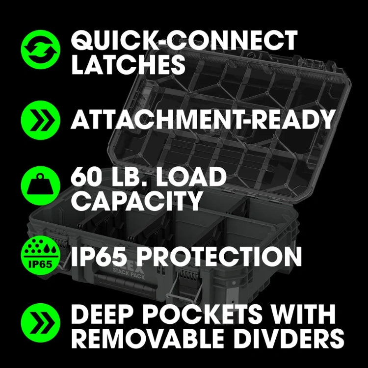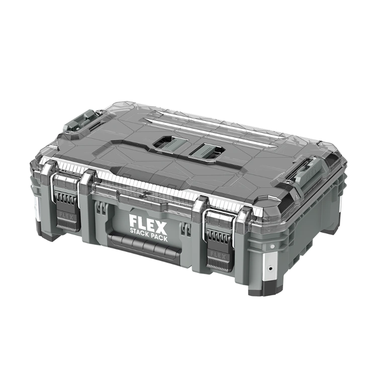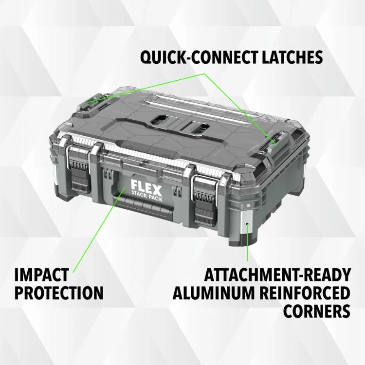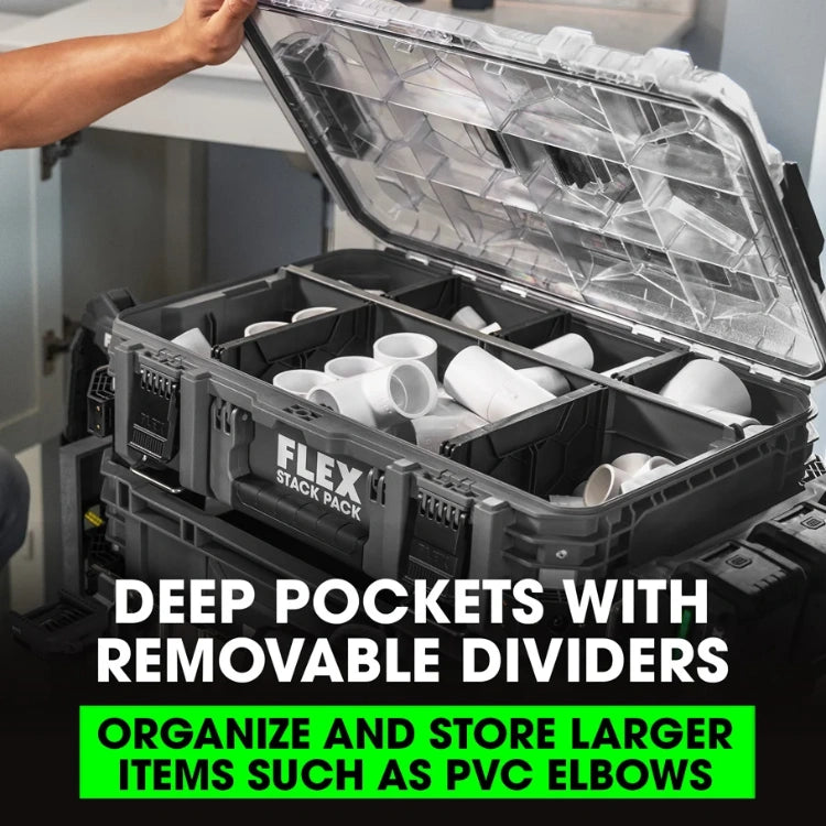 Organize and easily access the supplies you need for a day on the job with the FLEX STACK PACK™ Deep Organizer. Find the pieces you need quickly with its clear, see-through cover, then snap the lid securely back into place with the two-piece durable lock. IP65 all-weather protection shields your tools and accessories from the elements, and an impact-resistant polypropylene body with aluminum reinforced corners offers protection from the toughest jobsite conditions. Quick-connect interlocking attachment points offer fast and effortless connectivity with any piece in the STACK PACK™ storage system so you can custom build your layout for the ultimate traveling workshop. It’s protected by a one-year limited warranty when registered within 30 days of purchase at registermyflex.com.