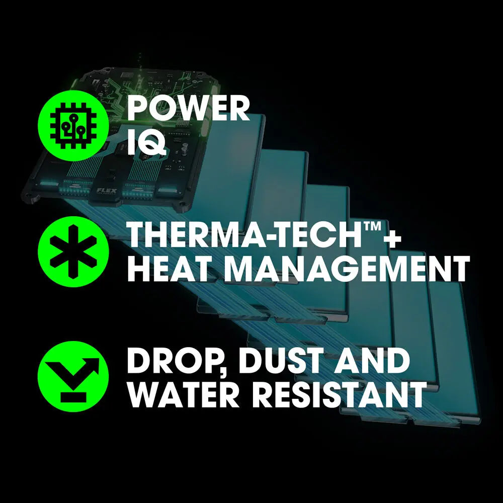 200% more power with 24V lithium, 300% longer battery life with THERMA-TECH™+ heat management, 100% faster charging; 100% cross-compatible with all FLEX 24V tools and chargers.