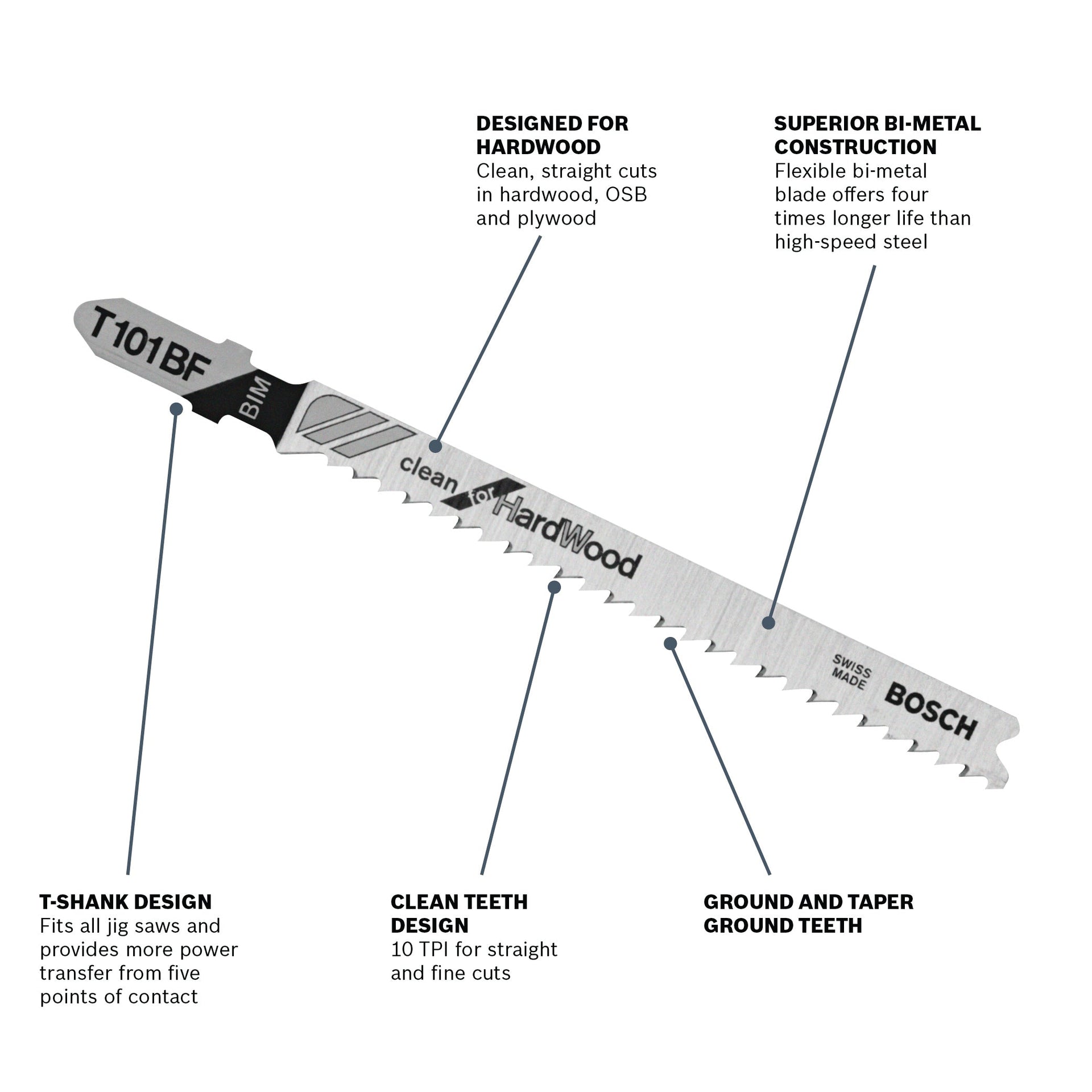 - BOSCH T101BF 5 pc. 4 In. 10 TPI Variable Pitch Clean for Hardwood T-Shank Jig Saw Blades