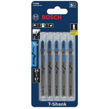 - BOSCH T118A 5 pc. 3-5/8 In. 17-24 TPI Basic for Metal T-Shank Jig Saw Blades