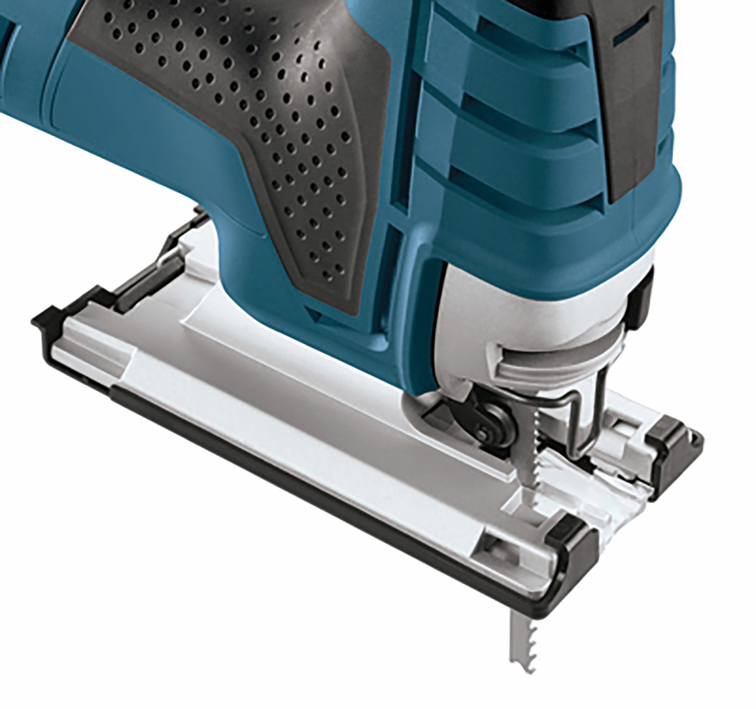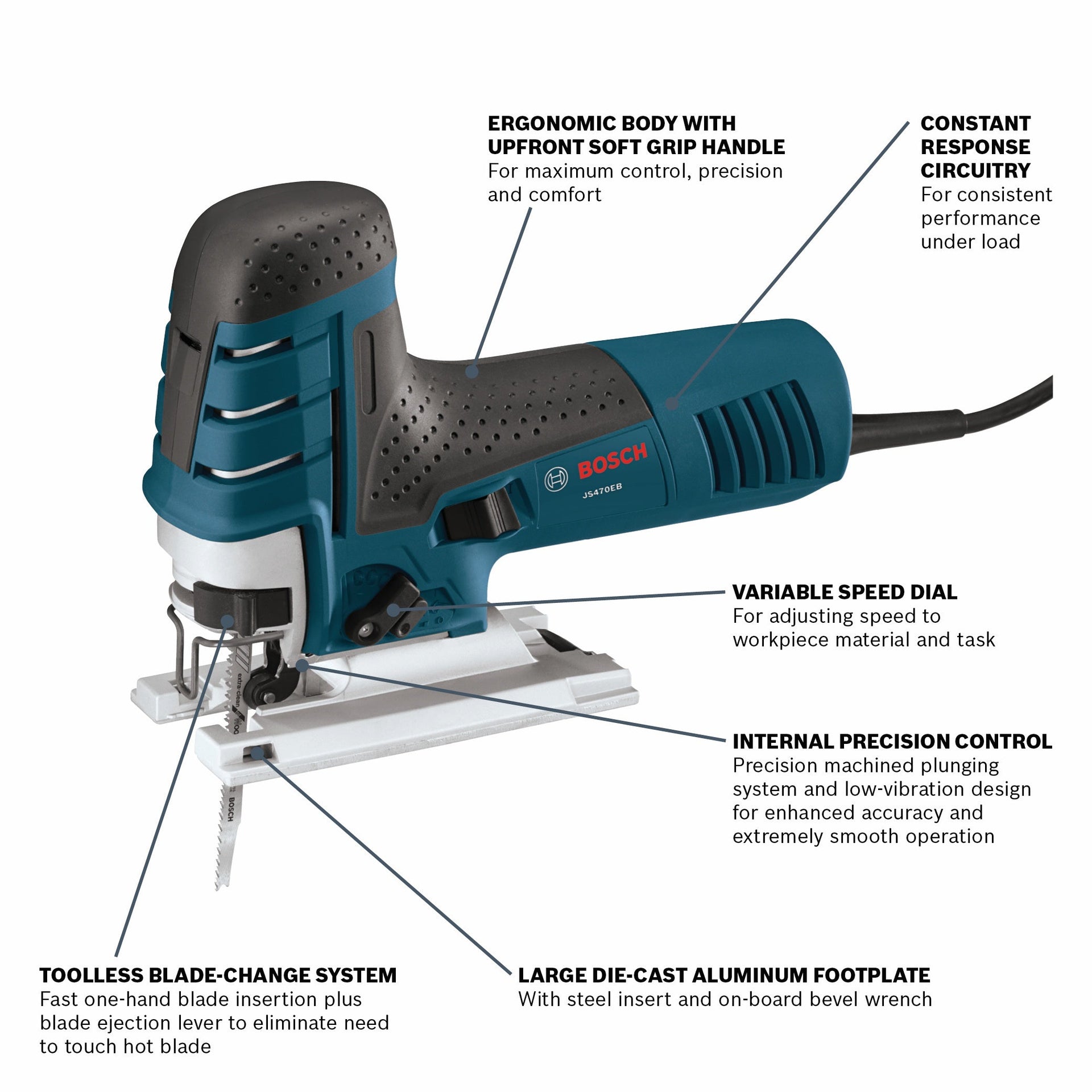 The Bosch JS470EB Barrel-Grip Jig Saw provides unsurpassed cut precision. Finish carpenters and kitchen and bath installers will appreciate the best-in-class 7.0 Amp motor and variable-speed control, making this saw an excellent choice for curve-cutting. It delivers 500 up to 3,100 strokes per minute – with a stroke length of 1 In. It has an ergonomic body with an upfront soft-grip handle for comfort and user control. It was manufactured with an aluminum gearbox. This fully counterbalanced low-vibration mechanism provides a low-vibration plunging design and Constant Response circuitry for consistent speed under load. It has a large die-cast aluminum footplate with a no-mar plastic overshoe. The JS470EB's multidirectional blade clamp delivers superior grip of T-shank blades (but it does not accept U-shank blades). A variable-speed dial sets the operating speed. The blade-ejection lever that eliminates need to touch hot blades. It has a dust blower for max cut-line visibility.
