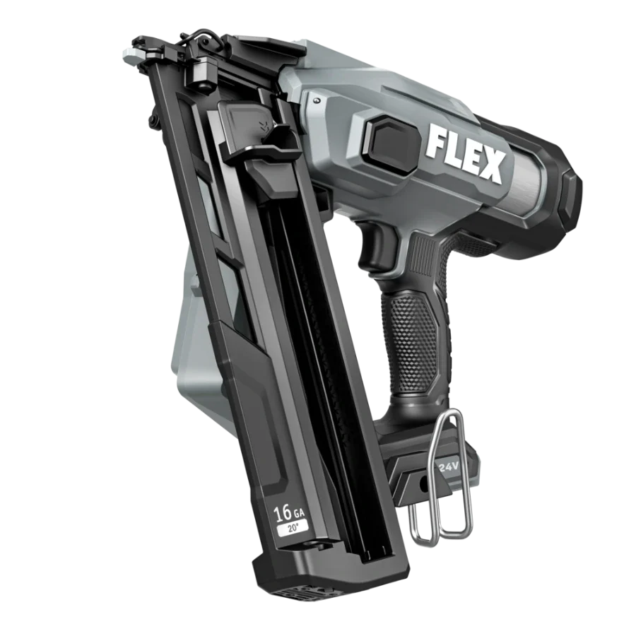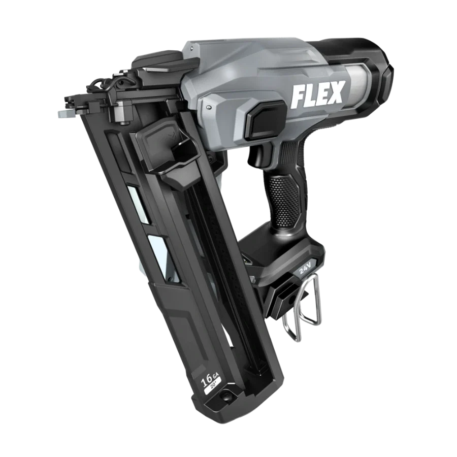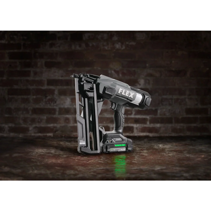rance allows you to quickly clear jammed nails without tools for maximum efficiency when you’re on the job. The cordless nailer is compact and lightweight to conquer tight spaces with minimal fatigue. Its heavy-duty belt clip can be mounted on either side of the tool and features a lead-in profile. The finish nailer accepts 1-1/4-inch to 2-1/2-inch 16-gauge fasteners. This cordless nailer delivers the FLEX Advantage of unmatched battery power, runtime, and fast charging. Kit includes the 16Ga Angled Finish Nailer, 2.5Ah lithium battery, 160W Fast Charger, belt clip, (3) no-mar tips, and a FLEX bag. It’s all protected by the FLEX Limited Lifetime Warranty when registered within 30 days of purchase at registermyFLEX.com through December 31, 2024.