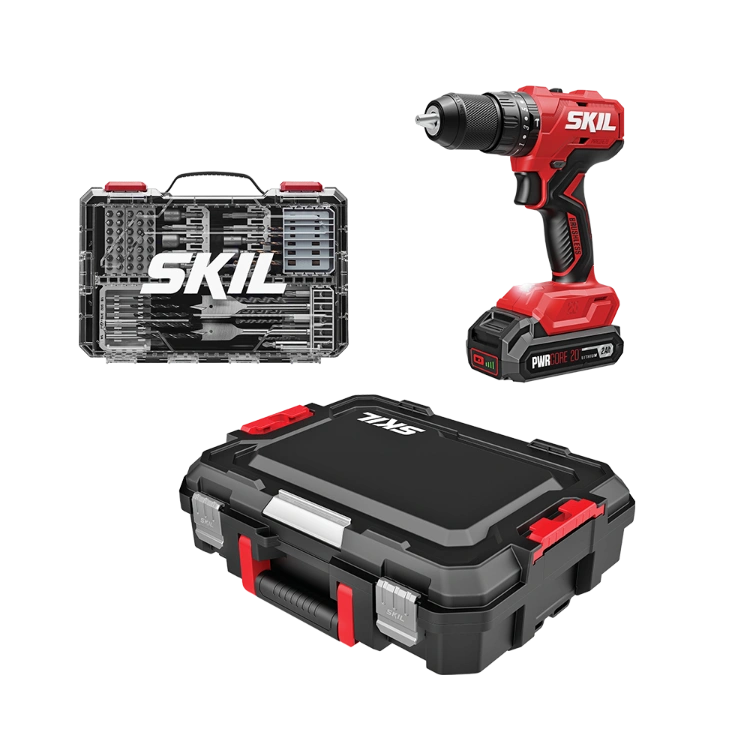 (1) 20V Brushless Hammer Drill [HD6280B-00], (1) PWRCORE 20™ 20V 2.0Ah battery [BY519701], (1) PWRCORE 20™ 20V 30W Charger [SC0030B-00], (1) SKIL interlock suitcase, (1) SKIL 75 Pc. Drill & Drive Bit Set with Interlocking Case Including: (36) 1 in screwdriving bits:(2) PH1, (4) PH2, (2) PH3, (2) SQ1,(3) SQ2, (2) SQ3, (2) TX15, (2) TX20, (2) TX25, TX30; HEX: 3/32, 5/32, (2) 3/16, (2) 1/8, 1/4; SL: 3, (2) 4, (2) 5, (2) 6. (14) 2 in screwdriving bits: (2) PH2, PH3, SQ2, TX20, TX25, TX30 SL4; HEX: 3/32, (2) 1/8, 5/32, (2) 3/16; (5) 1-7/8 length nut setters: ¼, 5/16, 3/8, 7/16, 1/2; (1) 2-3/8 magnetic extension holder, (7) black & golden twist drill bits (straight shank): (2) 1/16, (2) 1/8, 5/32, 3/16, 1/4; (5) Brad-point wood drill bits (straight shank): 1/8, 5/32, 3/16, 7/32, 1/4; (5) Carbide hammer drill bits (straight shank): 5/32, 3/16, ¼, 5/16, 3/8, (2) Spade drill bits: 3/4, 1