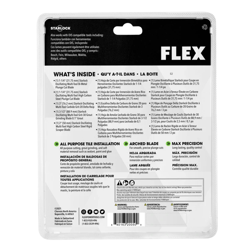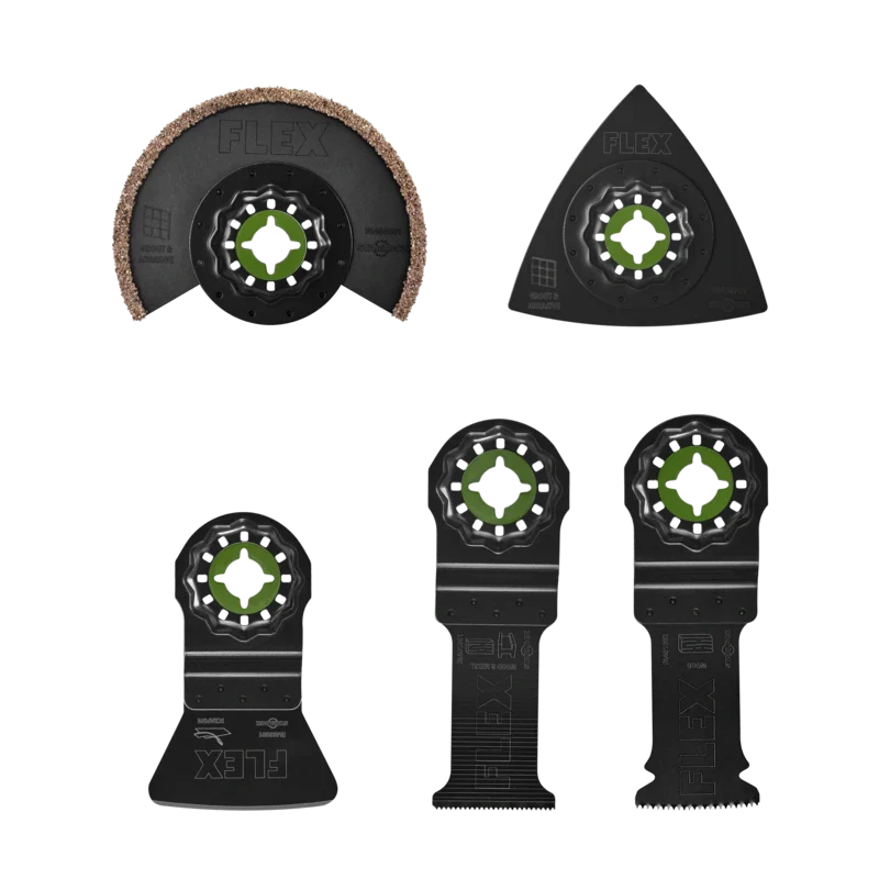 Tiling jobs stack best when you start fully equipped to expertly corner and cleave. The FLEX Tiling Project accessory set provides greater tiling advantage with a wide range of versatile blades for the FLEX Oscillating Multi-Tool. Each attaches firmly with the performance-enhancing Starlock Interface for total tiling domination. Prepare to cut, grind, scrape with unmatched efficiency and precision till every last tile is laid.