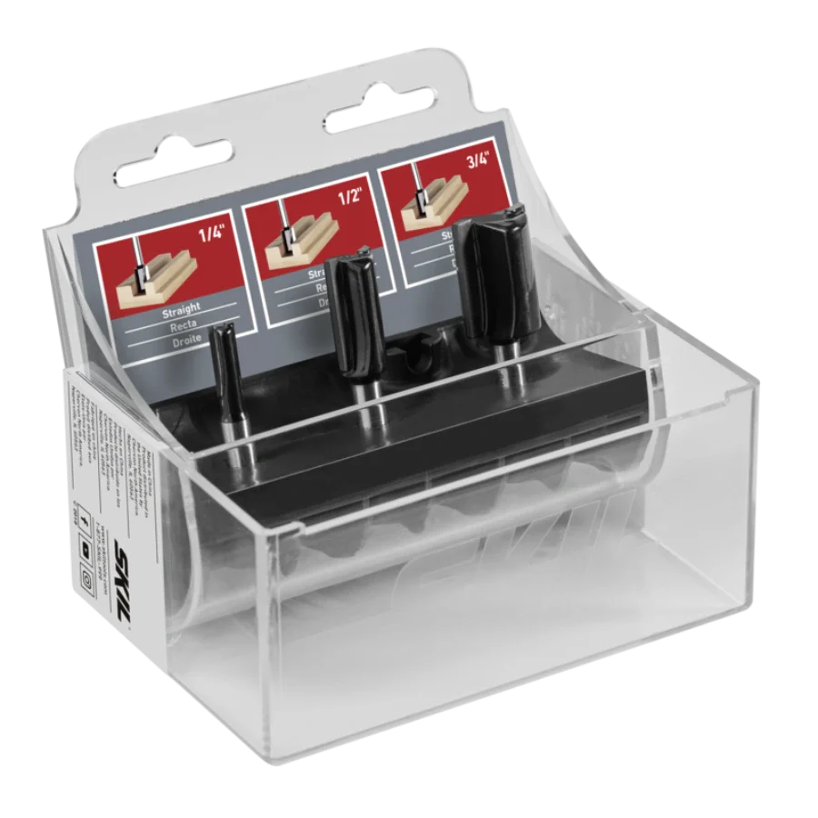- Includes: (1) 1/4-inch, (1) 1/2-inch, and (1) 3/4-inch straight bits